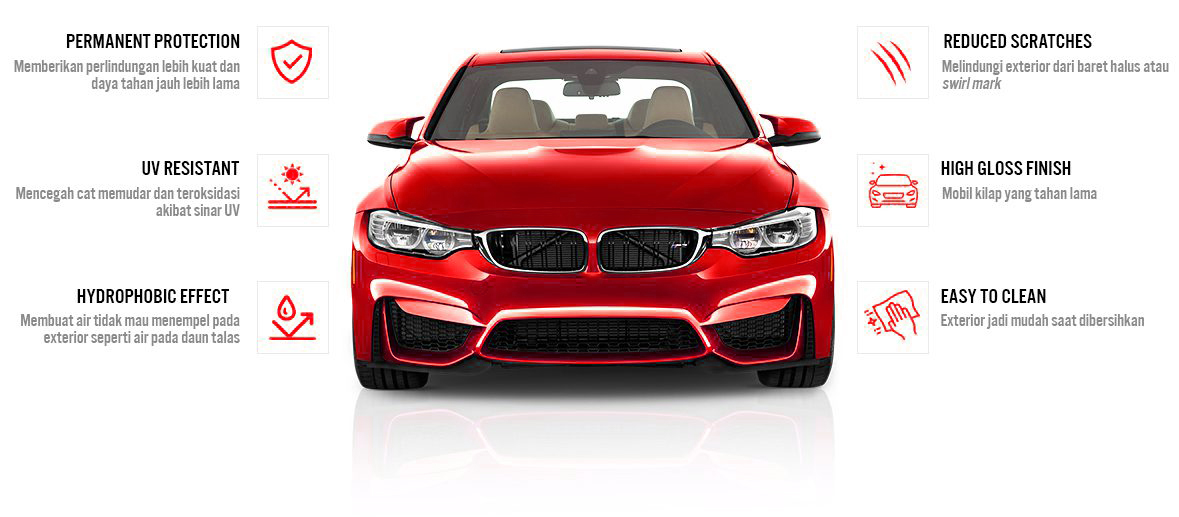 Nano Coating adalah lapisan perlindungan premium yang memberi kilau tahan lama, melindungi dari goresan ringan, air, debu, dan UV, serta menjaga warna cat tetap seperti baru.