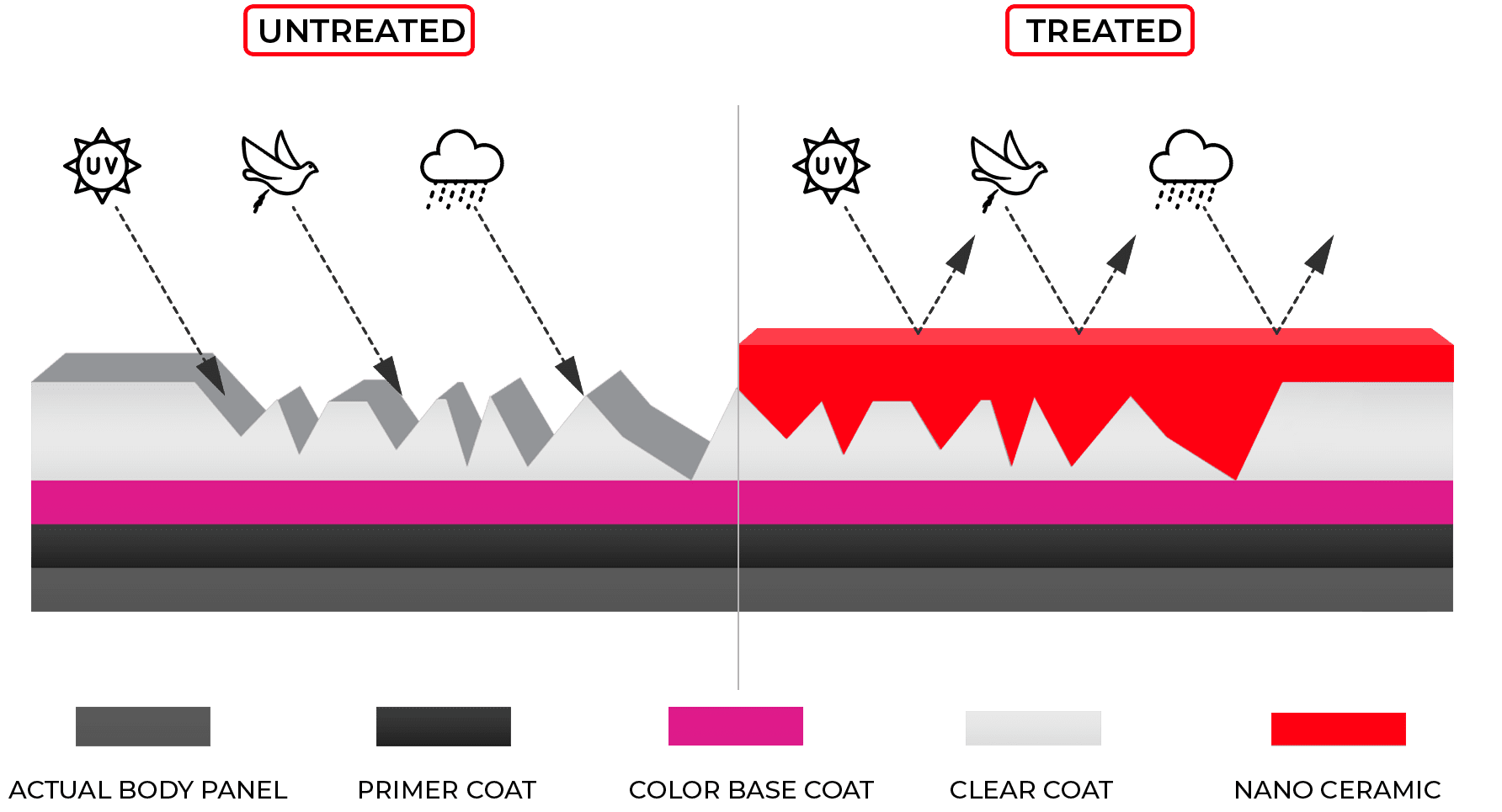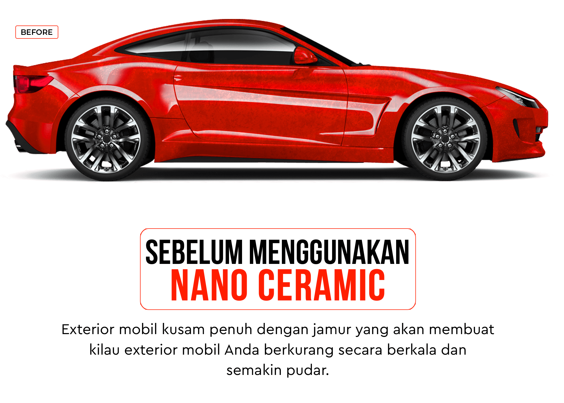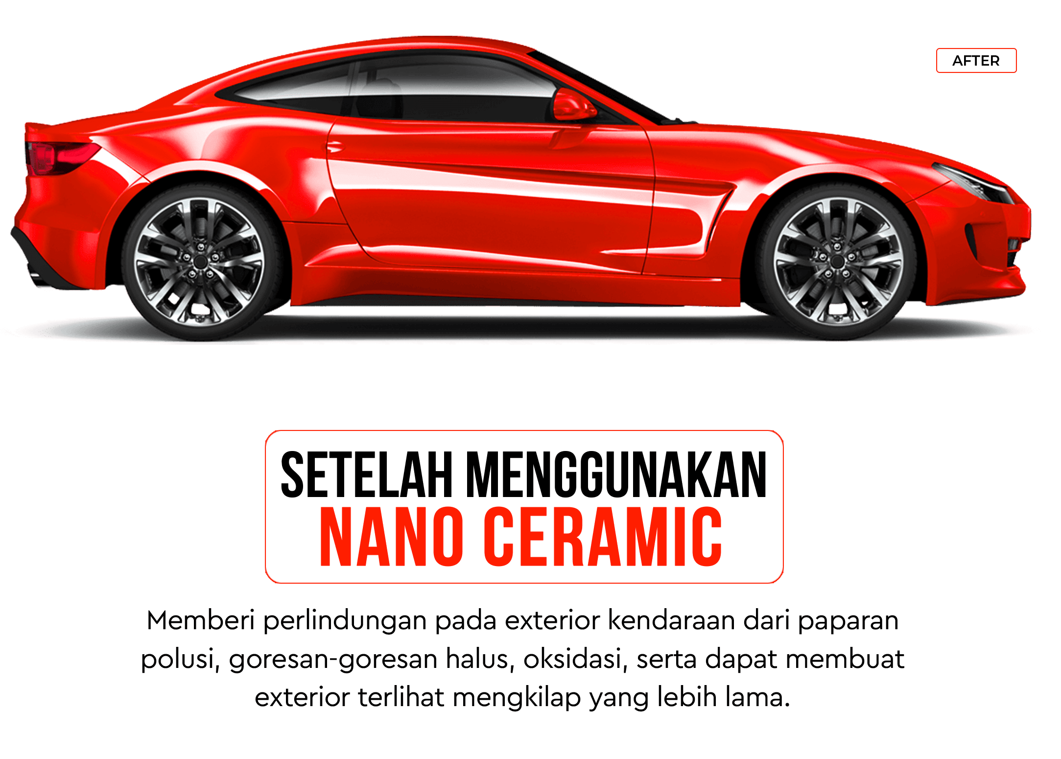 Nano Ceramic Coating ini berfungsi untuk menjaga tampilan mobil agar mengkilap seperti baru. Lapisan nano coating ini mampu melindungi cat pada body mobil dari paparan polusi, goresan halus, oksidasi, serta dapat memberikan efek mengkilap yang lebih lama.